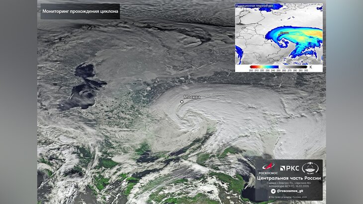 В сообщении отмечается, что на смену циклону, принесшему снег в столицу на прошлой неделе, пришёл балканский циклон, за прохождением которого следили спутники "Роскосмоса". Фотографии были сделаны с помощью спутников "Электро-Л" и "Арктика-М".
